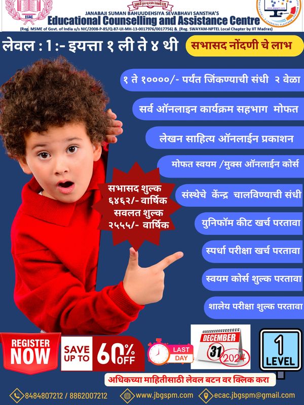 सभासद लाभ पुढील प्रमाणे असतील (ECAC नियमानुसार)-लेवल -१ (इयत्ता १ ली ते ४ थी)