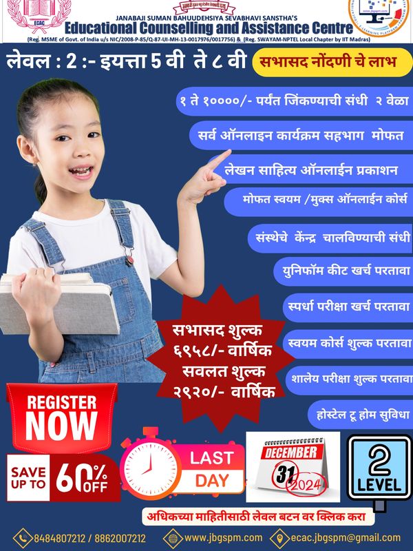 सभासद लाभ पुढील प्रमाणे असतील (ECAC नियमानुसार) लेवल : २ : इयत्ता ५ वी ते ८ वी