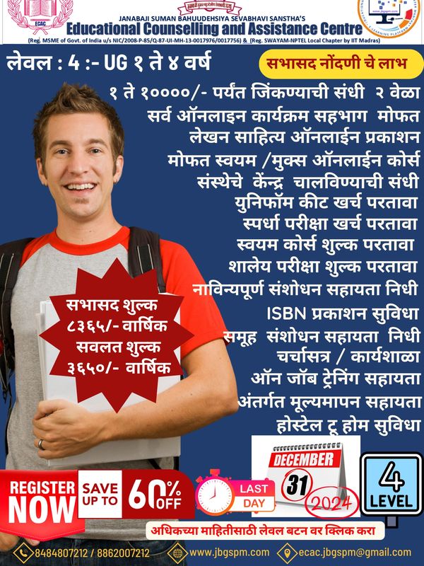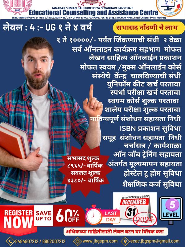 ४) आपण आम्हाला केलेल्या इमेल नुसार आपणास लेवल सिलेक्शन फॉर्म आपल्या इमेल वर पाठवीला जाईल. आपणास पाठविण्यात आलेल्या योजनेच्या फॉर्म ची प्रिंट काढून त्या सोबत त्या-त्या क्रमाने अचूक माहिती भरून योग्य ते कागद पत्रे, योजना शुल्क भरल्याचा पुरावा जोडून त्याची एकच पीडीएफ स्कॅन करायची आहे आणि ती पीडीएफ आमच्या ecac.jbgspm@gmail.com या इमेल वर सेंड करायची आहे.